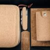 3. Zestaw do manicure z korkowym etui i zamknięciem na zatrzask. W zestawie nożyczki ze stali nierdzewnej, pęseta, obcinacz do paznokci, pilnik i obcinacz do skórek.